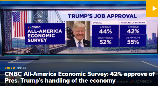 美国全国广播公司财经频道全美经济调查:42% 民众支持特朗普总统处理经济事务