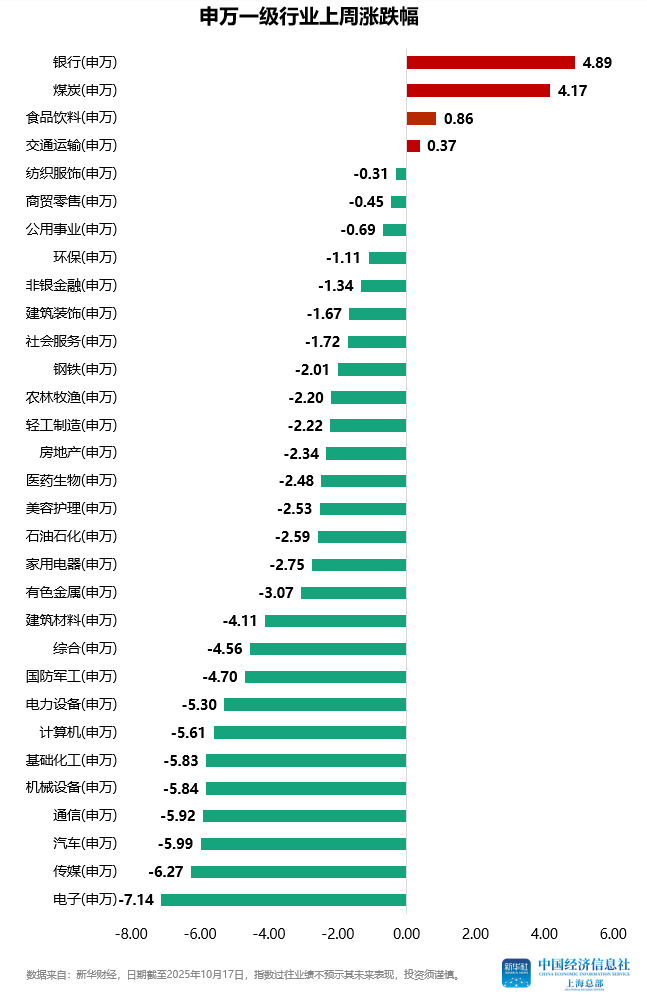 从申万一级行业来看,上周行业指数多数下跌,仅银行、煤炭、食品饮料、交通运输等少数行业指数上涨,电子、传媒、汽车、通信、机械设备等行业指数跌幅居前。
