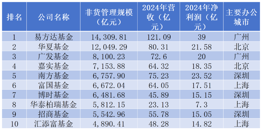 根据2025年初披露的2024年度公募基金公司经营数据,整理出非货币基金管理规模排名前十的公司信息如下(统计截至2024年底):