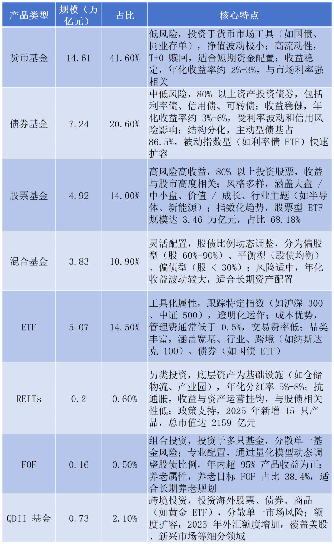下表是主要公募基金产品类型及核心数据(截至 2025 年 7 月):
