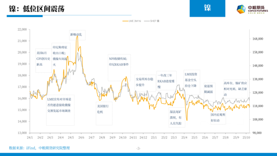 2024年至今镍价每一轮驱动主要来自供给端,因印尼镍产量占全球原生镍供应量的60%以上,其政策(配额、资源税使用税率等)对镍价走势影响明显。2024-2025年镍价波动从宽幅震荡转为窄幅低位震荡。