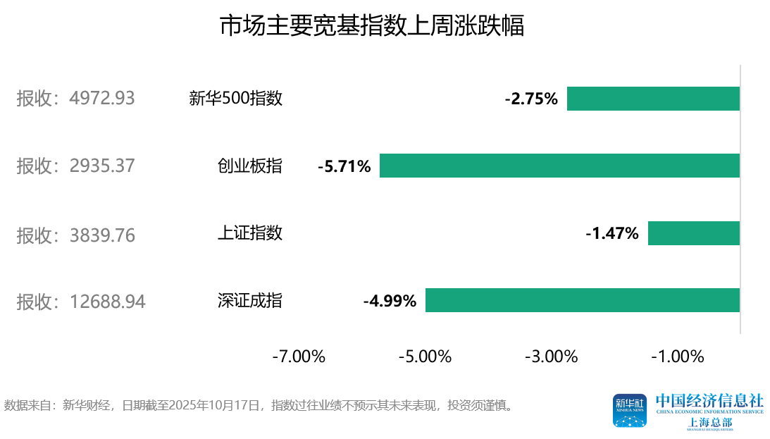 上周A股市场主要宽基指数集体回调。其中,上证指数周度下跌1.47%;深证成指周度下跌4.99%;创业板指周度下跌5.71%;新华500指数周度下跌2.75%。